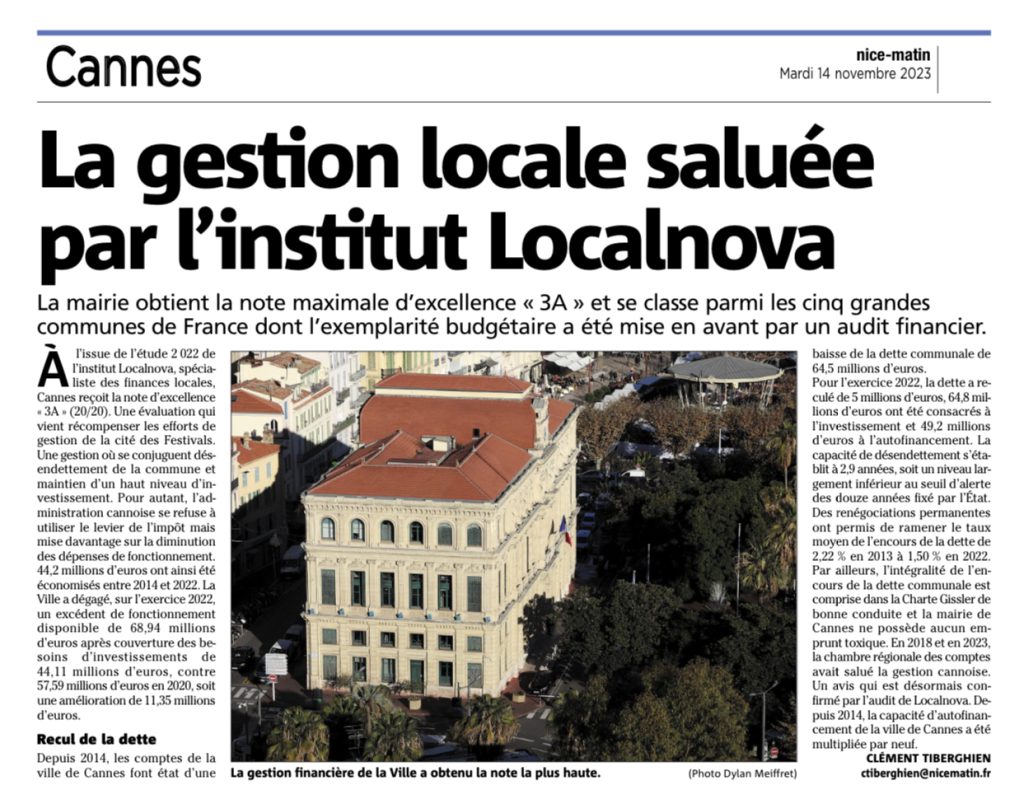 L’Institut Localnova, spécialisé dans l’analyse des finances publiques, a adressé la note maximale (3A) à la gestion budgétaire de la Mairie de Cannes.