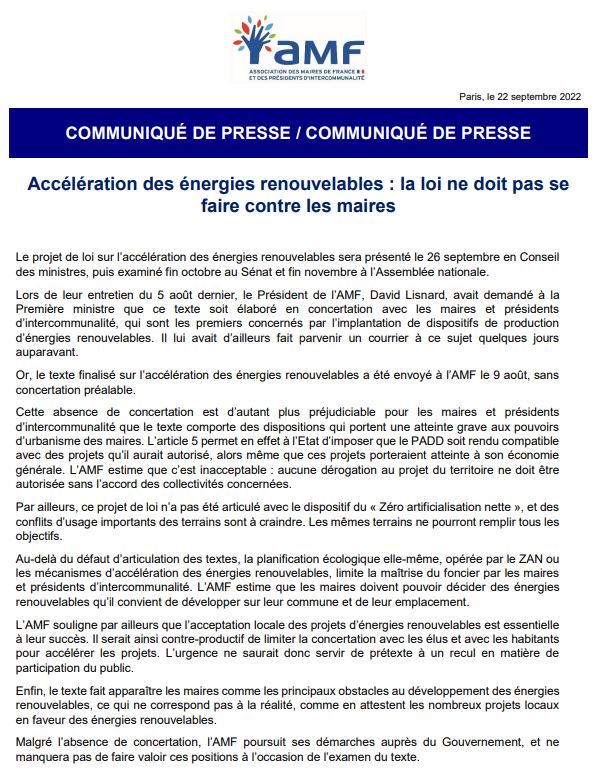 Accélération des énergies renouvelables : la loi ne doit pas se faire contre les maires