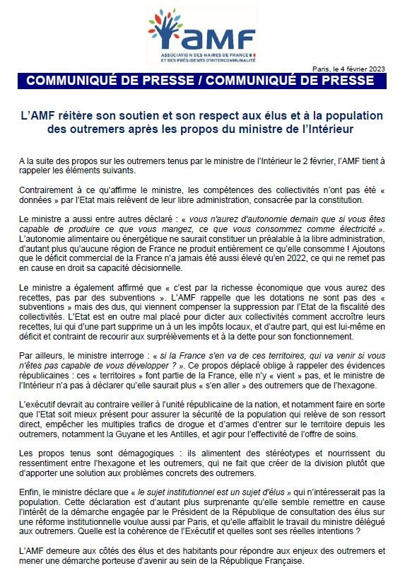 L’AMF réitère son soutien et son respect aux élus et à la population des outremers après les propos du ministre de l’Intérieur